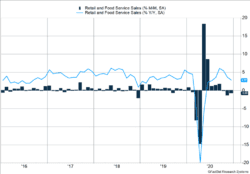 • Retail sales have declined for three consecutive months (dark blue bars). During the strong employment environment prior to COVID-19, there were only incidental declines.