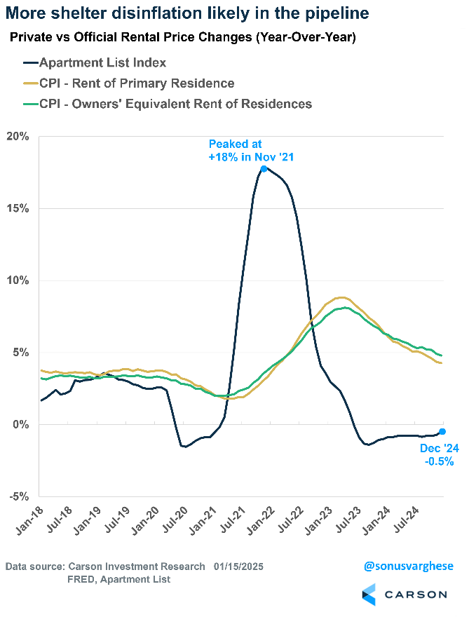Shelter inflation is inching ever closer to the pre-pandemic average. And there’s likely more disinflation in the pipeline, as we discussed in our 2025 Outlook. Apartment List reports that median rents are down 0.5% y/y, the 19th straight month with a negative y/y reading.