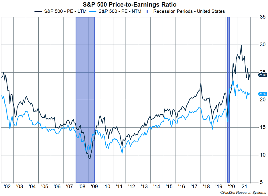 Earnings are likely to have grown more than 45% in 2021, based on the first three quarters of results and estimates for the fourth quarter. As shown in Figure 1, the strong earnings growth allowed the price-to-earnings (P/E) ratio to drop in 2021 even though markets moved significantly higher. While valuations have declined, they remain above average and are being supported by low bond rates. Figure 1 shows the next 12-month earnings (NTM) have fallen from a peak of 30 to just under 25. The last 12 months (LTM) P/E ratio has also declined.
