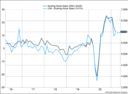 Houses are flying off the market. The average time to sell is 18 days, and half of homes sell in a week, often at prices above the listing. Competition for houses is fierce because of a lack of supply. As shown in Figure 1, existing home sales have dropped from above 6.5 million per month to just above 6 million. There are 28% fewer homes for sale compared to last year. Based on purchase rates, that is only 2.1 months’ supply. New homes show similar dynamics. Single-family home starts rose 15.3% in just one month. Inventory only covers 3.6 months of demand.
