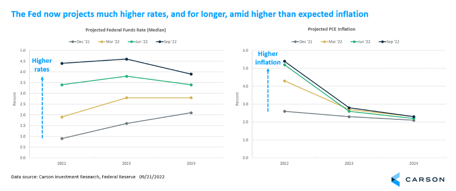 By the end of 2022, the Fed projects policy rates to reach 4.4%, a full percentage point above what was projected just three months ago in June. As of the end of 2023, the Fed now expects the target rate to hit 4.6%, about 0.8% above the previous projection. These projections have risen rapidly this year amid 40-year highs in inflation. Crucially, the Fed now projects staying at these high rates through 2024 at least.