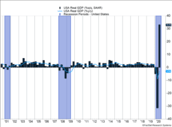 - U.S. GDP increased 33.1% last quarter as businesses reopened and fiscal policy support pushed consumer spending sharply higher.